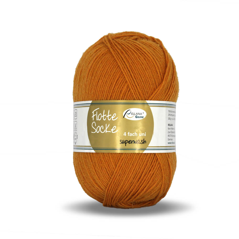 Włóczka skarpetkowa Rellana Uni to jednokolorowa włóczka, która ma swoim składzie ciepłą wełnę i wzmacniający ją poliamid. Skarpety zrobione z wełny wzmocnionej poliamidem są bardziej trwałe i nie przecierają się w newralgicznych miejscach. Piękne, nasycone kolory, to znak rozpoznawczy tej włóczki. Rellana Uni kolor 920, to taki jaśniejszy odcień rudego, mozna go nazwać musztardowym.
